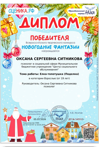 Психолог МБУ ЦСО Оксана Сергеевна Ситникова приняла участие во Всероссийском творческом конкурсе "Новогодняя фантазия". В категории "Поделка" для возрастной группы от 19 лет Оксана Сергеевна представила свою работу и работы коллег, которые были высоко оценены жюри.
